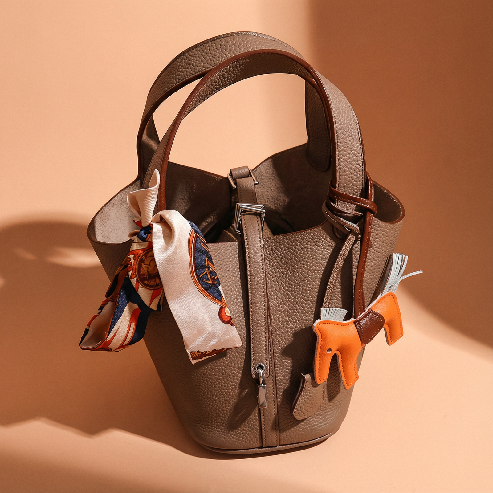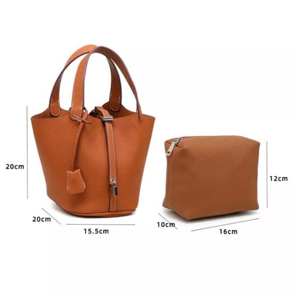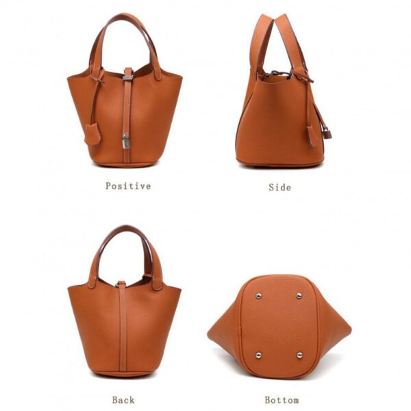 It features dual leather handles, an open-top design, and silver-tone hardware for a sophisticated finish. Inside, you’ll find a spacious open compartment along with a removable inner pouch in matching PU leather. The look is completed with a decorative front lock, adding a subtle statement to its clean design.
