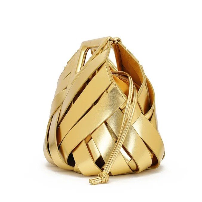 A sculptural woven bag with a distinctive triangular handle, designed to bring modern elegance to compact everyday styling.