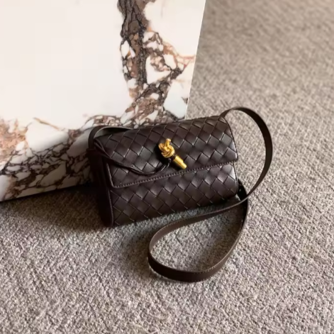 This sophisticated crossbody bag features a beautifully woven leather exterior in a rich burgundy color. The compact rectangular shape measures approximately 22cm long, 5cm wide, and 13cm height – perfect for carrying essentials while maintaining a sleek silhouette.